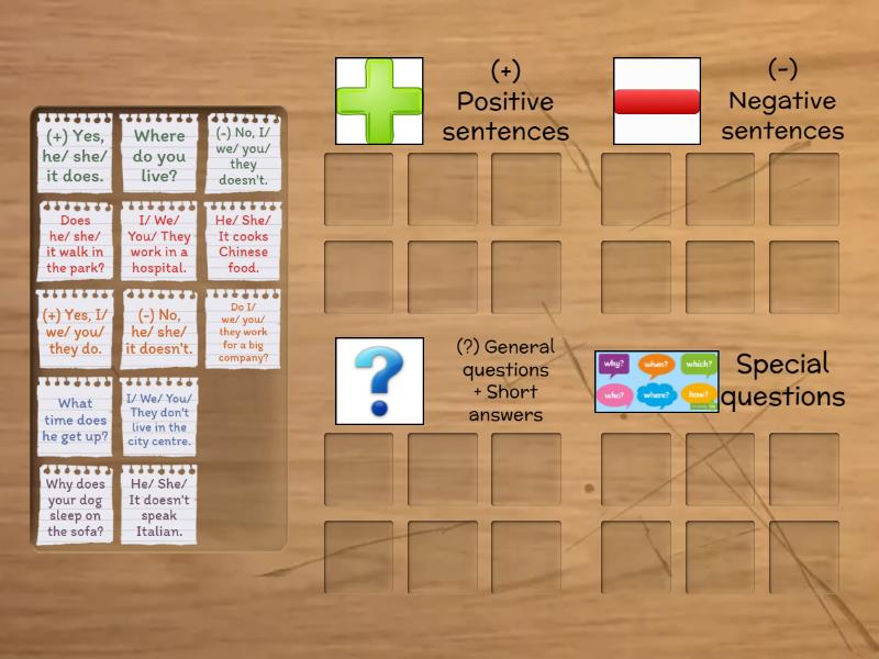 (+) Positive sentences: I/ We/ You/ They work in a hospital., He/ She/ It cooks Chinese food., (-) Negative sentences: I/ We/ You/ They don't live in the city centre., He/ She/ It doesn't speak Italian., (?) General questions + Short answers: Do I/ we/ you/ they work for a big company?, Does he/ she/ it walk in the park?, (+) Yes, I/ we/ you/ they do., (-) No, I/ we/ you/ they doesn't., (+) Yes, he/ she/ it does., (-) No, he/ she/ it doesn't., Special questions: Where do you live?, What time does he get up?, Why does your dog sleep on the sofa?,