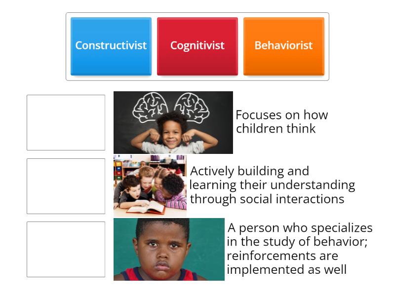 Behaviorist - A person who specializes in the study of behavior; reinforcements are implemented as well , Constructivist - Actively building and learning their understanding through social interactions , Cognitivist - Focuses on how children think,
