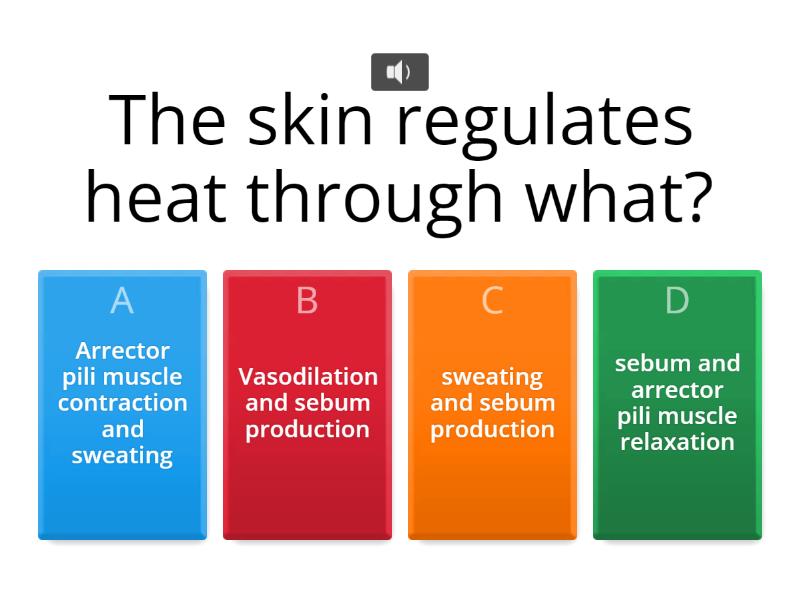 1) The skin regulates heat through what? a) Arrector pili muscle contraction and sweating b) Vasodilation and sebum production c) sweating and sebum production d) sebum and arrector pili muscle relaxation 2) True or False? Sensation acts as a sense organ to detect changes in the environment such as heat, cold, touch, pressure and pain. a) True b) False 3) Sensory messages from the skin are interpreted through which system? a) Endocrine b) Integumentary c) Limbic d) Nervous 4) True or False? Heat regulation helps to keep the body at a constant temperature of 37°C by dilation (widening) and constriction (narrowing) of the blood vessels. a) True b) False 5) Sebum production on to the skins surface is known as? a) Excretion b) Toning c) Secretion d) Cleansing 6) What is the missing word? I can contain certain particles that are small enough to be ............. such as female hormones, nicotine patches, ingredients within facial preparations etc. a) Excreted b) Absorbed c) Protected 7) What is my name? I am the Horny layer of the epidermis where the cells are continually shed via desquamation a) Dermis b) Stratum Corneum c) Stratum Granulosum d) Stratum Spinosum 8) Waste products such as lactic acid, urea and salts are lost through perspiration, however this is only minor. What function am I? a) Secretion b) Excretion c) Absorption 9) What is tinea corpis? a) broken red capillaries on skins surface b) a raised, shiny area of skin c) irregular patches of red skin with slivery scales. possibly weeping and inflammed if severe. d) red scaly circular patches of skin forming a ring around healthy skin. 10) Basal layer of the epidermis where mitosis occurs and melanin cells are found. a) Stratum Corneum b) Stratum germinativum c) Dermis d) Stratum Spinosum 11) What are the characteristics of vitiligo/hypo-pigmentation? a) dark patches of pigment usually found around mouth b) a raised, shiny area of skin c) white patches of skin with no pigment d) irregular patches of red skin with slivery scales. possibly weeping and inflammed if severe.