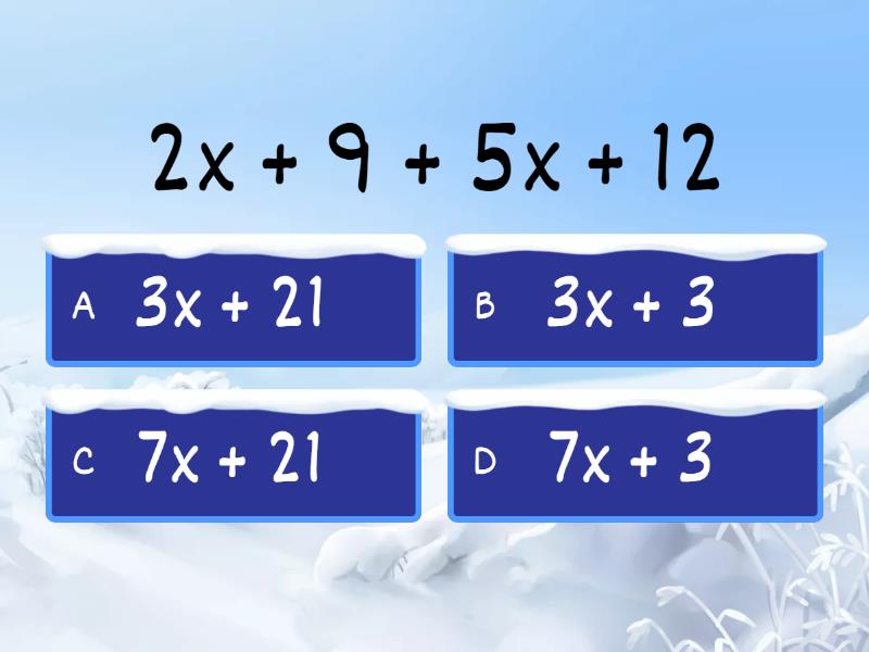 1) 2x + 9 + 5x + 12 a) 3x + 21 b) 3x + 3 c) 7x + 21 d) 7x + 3 2) 6m + 3 - 4m + 8 a) 2m +11 b) 10m + 11 c) 2m + 5 d) 10m + 5 3) -5y + 7 - 3y - 4 a) 8y + 3 b) -8y + 3 c) 2y + 3 d) -2y + 3 4) 2.(3x + 5) a) 3x + 5 b) 6x + 5 c) 3x + 10 d) 6x + 10 5) 5.(-6x + 4) a) 30x + 20 b) 30 + 20 c) -30x - 20 d) -30x + 20 6) 6.(-4n - 3) a) 24n + 18 b) -24n + 18 c) 24n - 18 d) -24n - 18