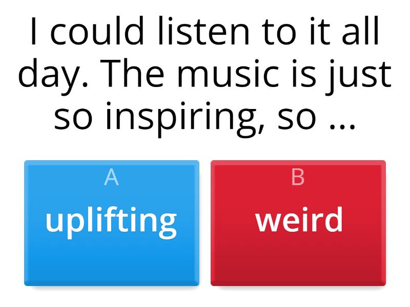 1) I could listen to it all day. The music is just so inspiring, so ... a) uplifting b) weird 2) I saw it twice. The plot was really exciting, just really ... a) gripping b) catchy 3) Why is this play so popular? I thought it was terrible, absolutely ... a) over-the-top b) awful 4) I can't stand her acting. She's just too much, always so ... a) over-the-top b) dull 5) It all sounds the same to me. It's only produced to make money, just very ... a) hilarious b) commercial 6) The show was amazing, I hadn't laughed so hard in a long time. It was very very ... a) funny b) hilarious