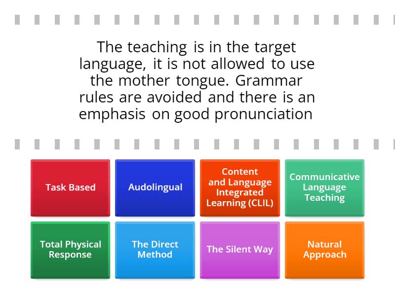 The Direct Method - The teaching is in the target language, it is not allowed to use the mother tongue. Grammar rules are avoided and there is an emphasis on good pronunciation, Task Based - It focuses on the completion of an interesting task by using the language they already have, Natural Approach - Learning takes place by the students being exposed to the language that is comprehensible to them. Proposed by Professor S. Krashen, Total Physical Response - The learners respond to simple commands given by the teacher. The aural comprehension is important for this method, The Silent Way - The teacher says as little as possible in order that the learner can be in control of what he wants to say. The mother tongue is not used, Audolingual - There is much practice of dialogues of every situation. New language is first heard and drilled before writing, Communicative Language Teaching - The focus is to enable the learner to communicate effectively and appropriately in vaious situations. The content are functions., Content and Language Integrated Learning (CLIL) - Teaching is organized around the content or subject matter that the students will acquire (History, Maths, Nature),