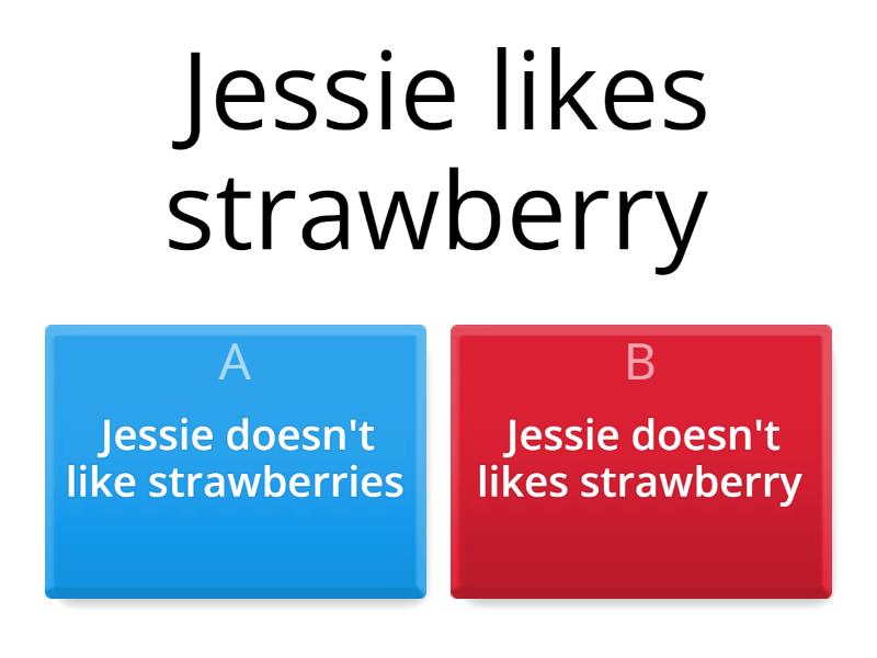 1) Jessie likes strawberry a) Jessie doesn't like strawberries b) Jessie doesn't likes strawberry 2) My mom and I go to the gym everyday a) My mom and I doesn't go to the gym everyday b) My mom and I don't go to the gym everyday 3) Sarah is having violin lessons right now a) Sarah isn't having violin lessons right now b) Sarah doesn't have violin lessons right now 4) Julia and Levi are planning a party a) They aren't planning a party b) They don't plan a party 5) I always travel to the beach in the Summer a) I don't travel to the beach in the Summer b) I am not travel to the beach in the Summer 6) She cooks a delicious pasta every Sunday a) She doesn't cooks a delicious pasta b) She does not cook a delicious pasta 7) She chats with her friends from Madrid a) She doesn't often chat with her friends from Madrid b) She doesn't chats with her friends from Madrid