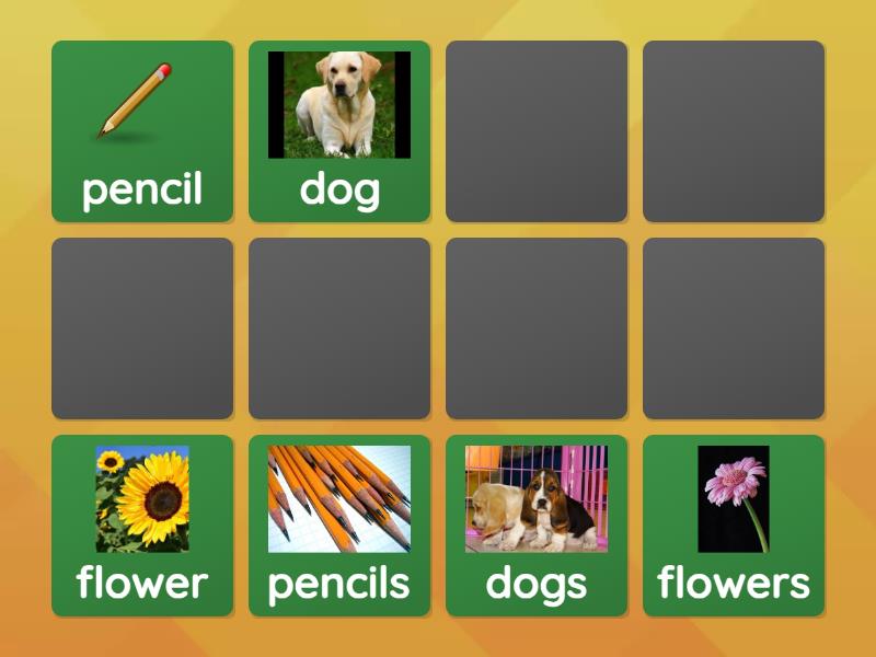 dog - dogs, flower - flowers, pencil - pencils, boys - boy, car - cars, shoe - shoes,