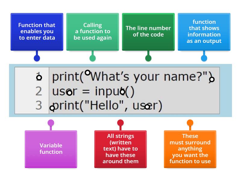 function that shows information as an output, All strings (written text) have to have these around them, These must surround anything you want the function to use, The line number of the code, Variable function, Function that enables you to enter data, Calling a function to be used again.