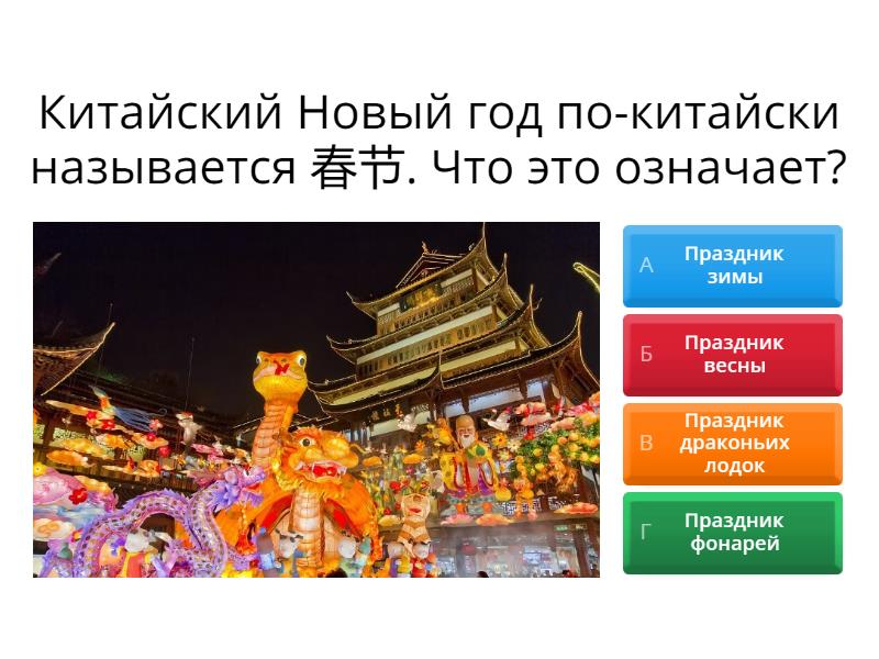 1) Китайский Новый год по-китайски называется 春节. Что это означает? a) Праздник зимы b) Праздник весны  c) Праздник драконьих лодок d) Праздник фонарей  2) Когда отмечают Китайский Новый год ? a) 20 января  b) 9 февраля c) Каждый год по-разному d) 17 февраля 3) Главный подарок, который дарят в честь Нового года  a) Фонарик b) Статуэтка c) Украшение d) Красный конверт 4) Одно из традиционных блюд на китайском новогоднем столе  a) Пельмени (饺子) b) Тофу c) Рис d) Лунные пряники 5) Зачем китайцы делают генеральную уборку перед Праздником Весны? a) Чтобы отпугнуть монстра b) Чтобы не было стыдно перед гостями c) Чтобы будущий год принёс удачу 6) Как отпугнуть Ньена? a) Угостить его едой b) Сделать генеральную уборку дома c) Повесить на двери парные надписи и взорвать хлопушки d) Подарить ему красный конверт 7) Что держит в руках девочка ? a) Lánbāo b) Hóngbāo c) Hēibāo d) Báibāo 8) Какого атрибута НЕТ в праздновании Китайского Нового года ? a) b) c) d) e) 9) Почему китайцы вешают перевернутый иероглиф 福 (счастье)? a) Этот иероглиф обозначает "перевернуться" b) "Перевернут созвучен со словом"наступить" c) Нет разницы, как развешивать