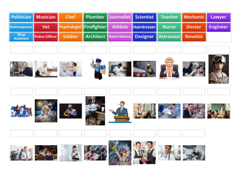 Doctor, Architect, Plumber, Journalist, Vet, Teacher, Astronaut, Athlete, Novelist, Chef, Designer, Waiter/Waitress, Shop Assistant, Soldier, Psychologist, Politician, Mechanic, Hairdresser, Musician, Nurse, Scientist, Police Officer, Engineer, Firefighter, Lawyer, Businessperson,