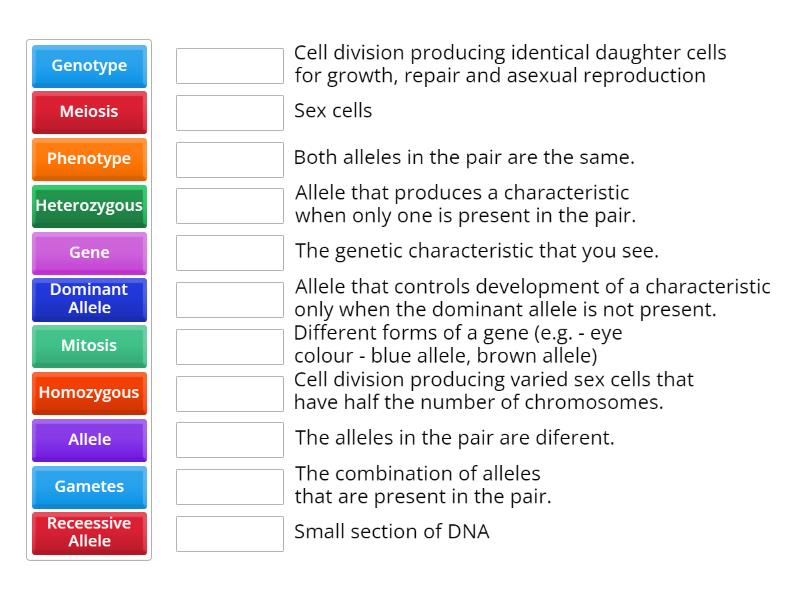 Allele - Different forms of a gene (e.g. - eye colour - blue allele, brown allele), Dominant Allele - Allele that produces a characteristic when only one is present in the pair., Receessive Allele - Allele that controls development of a characteristic only when the dominant allele is not present., Gene - Small section of DNA, Homozygous - Both alleles in the pair are the same., Heterozygous - The alleles in the pair are diferent., Phenotype - The genetic characteristic that you see., Genotype - The combination of alleles that are present in the pair., Mitosis - Cell division producing identical daughter cells for growth, repair and asexual reproduction, Meiosis - Cell division producing varied sex cells that have half the number of chromosomes., Gametes - Sex cells,