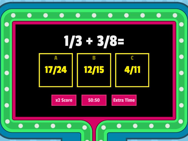 1) 1/3 + 3/8= a) 17/24 b) 12/15 c) 4/11 2) 4/5 + 3/4= a) 12/20 b) 31/20 c) 7/9 3) 1/6 + 1/5= a) 11/11 b) 2/11 c) 11/30 4) 4/7 + 3/4 = a) 28/21 b) 37/28 c) 12/28 5) 3/10 + 2/5 = a) 7/10 b) 6/50 c) 5/15 6) 1/3 + 4/9 a) 7/9 b) 6/12 c) 5/9 7) 1/5 + 3/4 a) 19/20 b) 4/9 c) 4/20 d) 17/20 8) 3/8 + 1/4 a) 4/12 b) 17/24 c) 5/8 d) 15/24 9) 2/5 + 5/7 a) 1 and 4/35 b) 1 and 29/35 c) 3 and 9/35