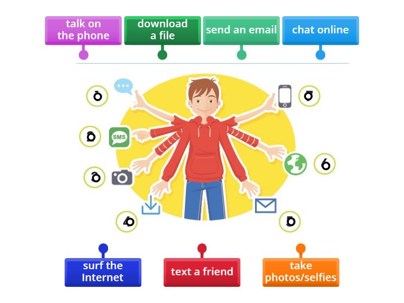 chat online, text a friend, take photos/selfies, download a file, talk on the phone, surf the Internet, send an email.