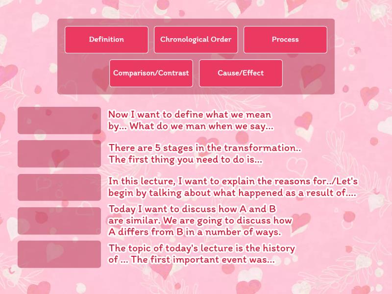 Comparison/Contrast - Today I want to discuss how A and B are similar. We are going to discuss how A differs from B in a number of ways., Cause/Effect - In this lecture, I want to explain the reasons for../Let's begin by talking about what happened as a result of...., Definition - Now I want to define what we mean by... What do we man when we say..., Chronological Order - The topic of today's lecture is the history of ... The first important event was..., Process - There are 5 stages in the transformation.. The first thing you need to do is...,