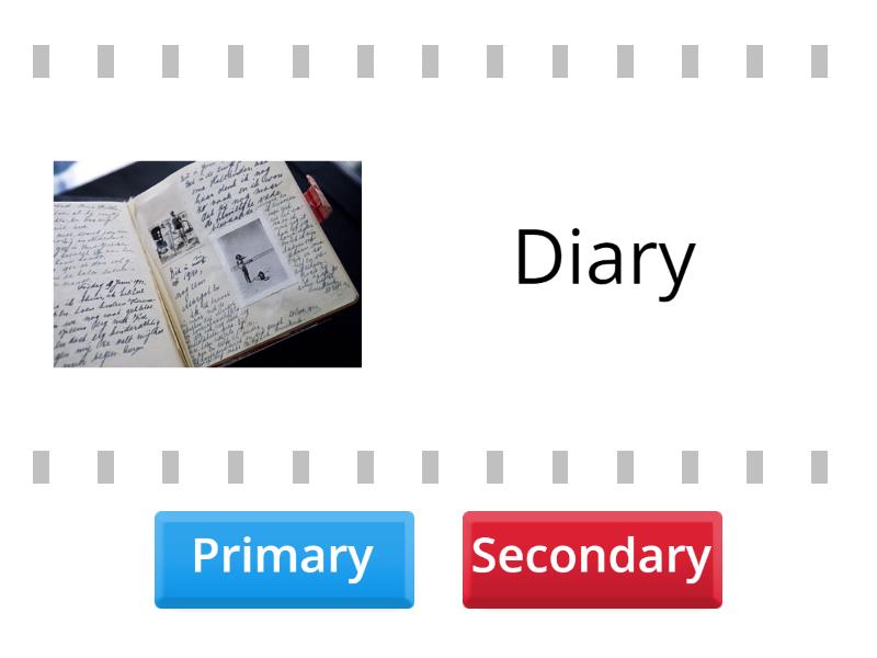 Primary: Diary , Photograph of Civil War, Speech of MLK, Interview with George Bush, Artifact, Secondary: News report, History Textbook, Encyclopedia, Biography of Lincoln,