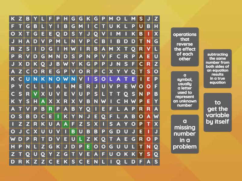 variable - a symbol, usually a letter used to represent an unknown number, isolate - to get the variable by itself, inverse operations - operations that reverse the effect of each other, unknown - a missing number in a problem, subtraction property - subtracting the same number from both sides of an equation results in a true equation,