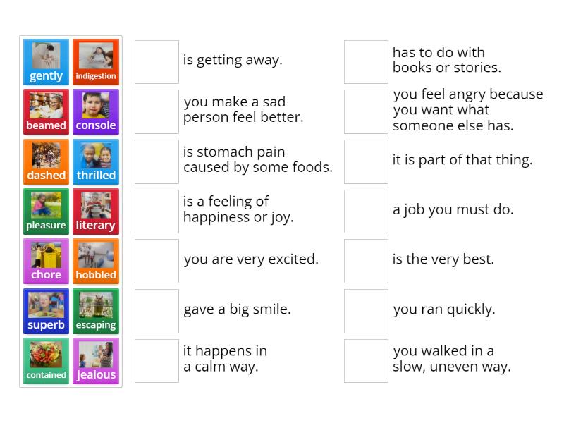 literary - has to do with books or stories. , pleasure - is a feeling of happiness or joy. , thrilled - you are very excited. , hobbled - you walked in a slow, uneven way. , indigestion  - is stomach pain caused by some foods. , jealous - you feel angry because you want what someone else has. , dashed - you ran quickly. , escaping - is getting away. , superb - is the very best. , gently - it happens in a calm way. , beamed - gave a big smile. , chore - a job you must do. , console - you make a sad person feel better. , contained - it is part of that thing. ,