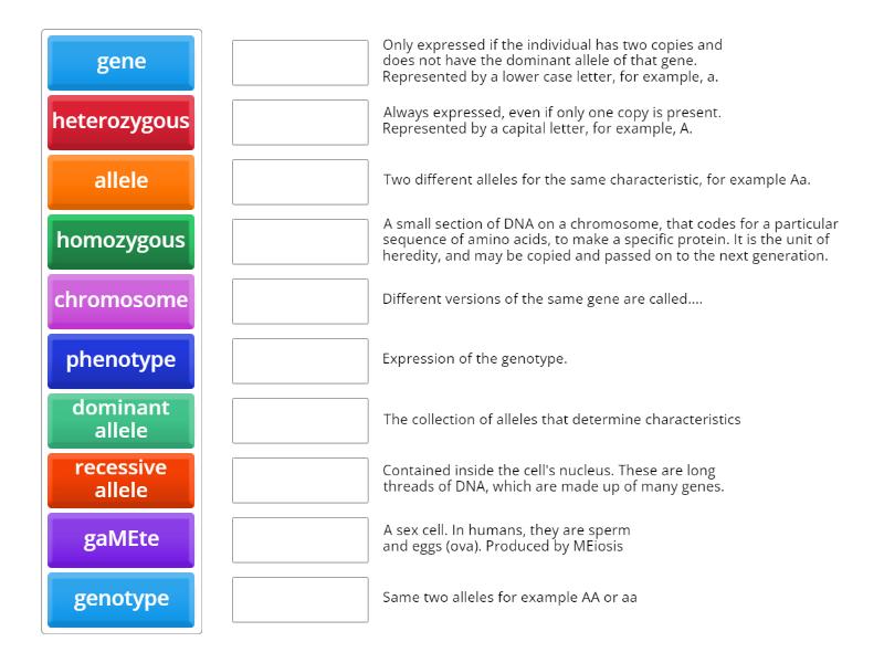 gaMEte - A sex cell. In humans, they are sperm and eggs (ova). Produced by MEiosis, chromosome - Contained inside the cell's nucleus. These are long threads of DNA, which are made up of many genes., gene - A small section of DNA on a chromosome, that codes for a particular sequence of amino acids, to make a specific protein. It is the unit of heredity, and may be copied and passed on to the next generation., allele - Different versions of the same gene are called...., dominant allele - Always expressed, even if only one copy is present. Represented by a capital letter, for example, A., recessive allele - Only expressed if the individual has two copies and does not have the dominant allele of that gene. Represented by a lower case letter, for example, a., homozygous - Same two alleles for example AA or aa, heterozygous - Two different alleles for the same characteristic, for example Aa., genotype - The collection of alleles that determine characteristics, phenotype - Expression of the genotype.,