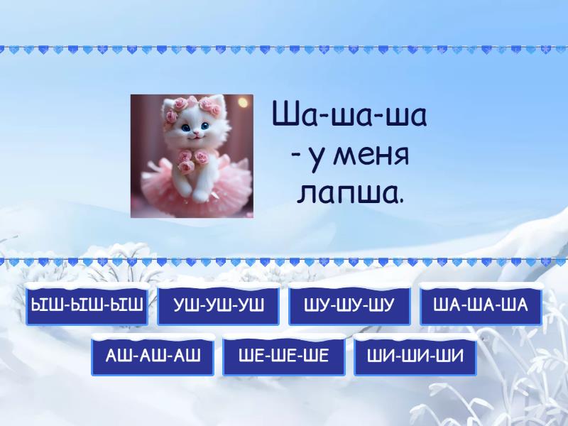 ША-ША-ША - Ша-ша-ша - у меня лапша., ШУ-ШУ-ШУ - Шу-шу-шу - шапку новую ношу., АШ-АШ-АШ - Аш-аш-аш - мы построили шалаш., ШЕ-ШЕ-ШЕ - Ше-ше-ше - это утка в камыше., ШИ-ШИ-ШИ - Ши-ши-ши - у меня карандаши., УШ-УШ-УШ - Уш-уш-уш - у нее лукошко груш., ЫШ-ЫШ-ЫШ - Ыш-ыш-ыш - нарисую рядом мышь.,