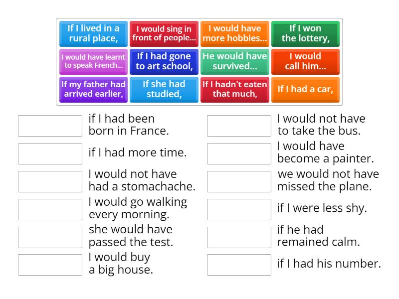 If I won the lottery, - I would buy a big house., If she had studied, - she would have passed the test., He would have survived... - if he had remained calm., I would call him... - if I had his number., If my father had arrived earlier, - we would not have missed the plane., If I lived in a rural place, - I would go walking every morning., If I had gone to art school, - I would have become a painter., If I had a car, - I would not have to take the bus., I would have learnt to speak French... - if I had been born in France., I would have more hobbies... - if I had more time., I would sing in front of people... - if I were less shy., If I hadn't eaten that much, - I would not have had a stomachache.,