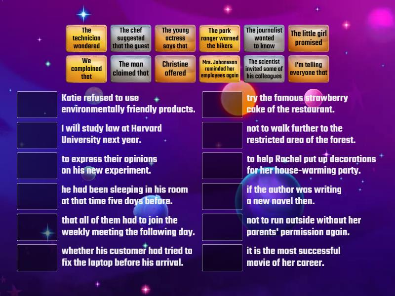 The young actress says that - it is the most successful movie of her career., The technician wondered - whether his customer had tried to fix the laptop before his arrival., Christine offered - to help Rachel put up decorations for her house-warming party., Mrs. Johansson reminded her employees again - that all of them had to join the weekly meeting the following day., We complained that - Katie refused to use environmentally friendly products., The park ranger warned the hikers - not to walk further to the restricted area of the forest., The journalist wanted to know - if the author was writing a new novel then., The scientist invited some of his colleagues - to express their opinions on his new experiment., The little girl promised - not to run outside without her parents' permission again., The man claimed that - he had been sleeping in his room at that time five days before., I'm telling everyone that - I will study law at Harvard University next year., The chef suggested that the guest - try the famous strawberry cake of the restaurant.,