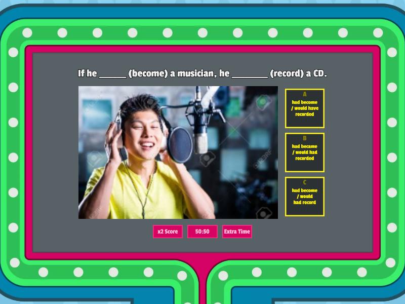 1) If he ______ (become) a musician, he ________ (record) a CD. a) had become / would have recorded b) had became / would had recorded c) had become / would had record 2) If she _______________ (go) to art school, she __________ (become) a painter. a) had went / would had become b) had gone / would have become c) had gon/ would have became 3) If I __________ (be) born in a different country, I __________ (learn) to speak a different language. a) had been / would had learned b) had be/ would have learn c) had been / would have learned 4) If he __________ (not take) the job, he _________ (go) travelling. a) haven't taken / would have went b) hadn't taken/ would have gone c) hadn't took / would have gone 5) If we ___________ (not go) to the party, we _______________ (not/meet) them. a) haven't go / would had met b) hadn't gone / would have meet c) hadn't gone/ wouldn't have met 6) He __________ (be) happier if he ____________ (stay) at home. a) would have be / had stayed b) would have been / had stayed c) would had been / had stood 7) If they ________________ (try) harder they _______________________ (finish) by now. a) tried / would had finished b) have tried / would have finish c) had tried / would have finished 8) If we __________________ (eat) that seafood we ____________________ (get) sick. a) didn't have eaten / would have got sick b) hadn't eaten / wouldn't have got sick c) haven't eaten / wouldn't have got sick 9) It ____________________ (be) better if you __________________ (buy) that old car. a) would have been / hadn't bought b) would had been / hadn't bought c) would have been/ hadn't buyed 10) If I _______________________ (write) to you sooner, you _________________ (feel) so lonely. a) had writed / wouldn't have b) had written / wouldn't have c) had writing / would have
