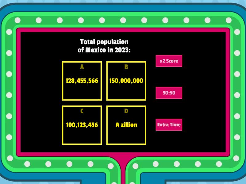 1) Total population of Mexico in 2023: a) 128,455,566 b) 150,000,000 c) 100,123,456 d) A zillion 2) Variables visualized by a population pyramid: a) Height and weight b) Age and sex c) Hair color and eye color d) Favorite ice cream flavor and shoe size 3) Who uses population pyramids and why: a) Chefs to create recipes b) Musicians to compose songs c) Wizards to cast age spells d) Demographers to study populations 4) Why it's called a population pyramid: a) Named after the Egyptian pyramids b) Shape resembles an actual pyramid c) Because it's built by ancient aliens d) Shape indicates population growth 5) What can a population pyramid show about gender differences: a) Favorite colors of males vs. females b) Which gender is better at sports c) Number of dependents and population structure d) Which gender has more wizards 6) Characteristics of an "expansive" population pyramid: a) High fertility and mortality among young b) Low fertility and high mortality among young c) Equal birth and death rates d) Made entirely of chocolate 7) Difference between "constrictive" and "expansive" population pyramids: a) "Constrictive" has wider middle due to older population b) "Constrictive" is narrower at the base c) "Constrictive" is taller d) "Constrictive" includes a mini roller coaster
