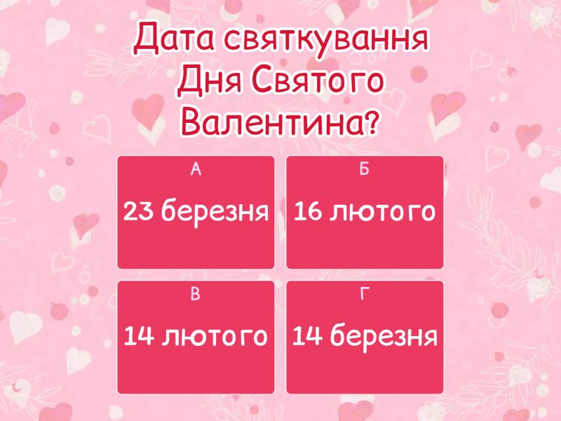 1) Дата святкування Дня Святого Валентина? a) 23 березня b) 16 лютого c) 14 лютого d) 14 березня 2) Де вперше відзначалося свято? a) У Стародавньому Римі b) У Візантії c) У Стародавній Греції d) У Стародавньому Єгипті 3) Хто був святим Валентином? a) Гончар b) Священник c) Пастух d) Жебрак 4) Як називаються листівки, які посилають один одному закохані у свято? a) Закоханці b) Серденька c) Валентинки d) Трояндочки 5) Єдина в світі країна, де це свято офіційно заборонено, причому під страхом великих штрафів? a) Саудівська Аравія b) Китай c) Німеччина d) Пакистан 6) Яку форму мають листівки-валентинки, якими обмінюються закохані? a) Зірки b) Ромашки c) Троянди d) Серця 7) На якому острові знайдено грецьку мармурову статую богині кохання Афродіти? a) Калімантан b) Балі c) Шрі-Ланка d) Мелос 8) Яке божество любові можна знайти на карті Далекого Сходу? a) Борисфен b) Амур c) Арес d) Гермес 9) Назвіть ім'я богині краси, любові, шлюбу в слов’янській міфології, яке стало маркою автомобіля. a) Афродіта b) Мазда c) Лада d) Персефона 10) При надлишку в страві якої приправи зазвичай задають єхидне питання: чи не закохався горе-кулінар? a) Паприка b) Сіль c) Перець d) 10 овочів 11) Поет любовних переживань - це ... Хто? a) Романтик b) Драматург c) Лірик d) Імпресіоніст 12) За підрахунками вчених, герої творів Шекспіра вимовляють це слово 2259 разів. Що це за слово? a) Любов b) Кохання c) Поцілунок d) Обійми 13) Як називається запальний, пристрасний танець кохання, що став серцем латиноамериканського карнавалу, який щорічно проходить в Ріо-де-Жанейро? a) Вальс b) Гопак c) Танго d) Самба 14) Цей мавзолей в пам'ять улюбленої дружини султана Шаха Джахана будувався 22 роки, а на роботах було зайнято 20 тисяч робочих. Про яке спорудження йде мова? a) Колізей b) Тадж-Махал c) Ейфелева вежа d) Храм Неба 15) Яка геометрична фігура частіше інших буває «любовною»? a) Трикутник b) Квадрат c) Коло d) Еліпс 16) Які білі птахи вважаються символом вірної любові? a) Лебеді b) Лелеки c) Голуби d) Чайки 17) Історію кохання якої знаменитої пари її автор назвав найсумнішою повістю на світі? a) Руслана і Людмили b) Орфея і Еврідіки c) Валентина та Валентини d) Ромео і Джульєтти 18) Що з перерахованого є символом любові? a) Стріла Амура b) Камінь Сізіфа c) Нитка Аріадни d) Дамоклів меч 19) В яку створену ним статую закохався міфологічний скульптор Пігмаліон? a) Афіни b) Галатеї c) Артеміди d) Афродіти 20) В якому році написана перша валентинка? a) 998 b) 1738 c) 1415 d) 1494