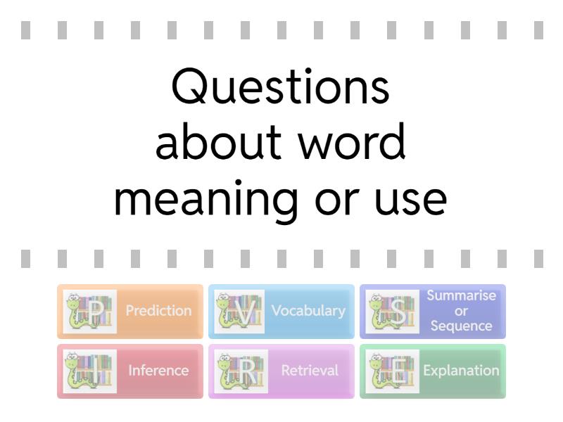 Vocabulary - Questions about word meaning or use, Inference - Read between the lines / clues in the text, Prediction - What might happen next?, Explanation - Explain and support your answer fully, including P.E.E.L, Retrieval - Focused "scanning" for specific information, Summarise or Sequence - List key points,
