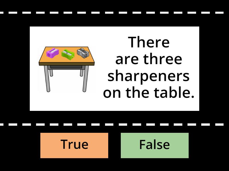 True: There are three sharpeners on the table., There are two school bags under the table., There are four pencils on the table., There are five markers under the table., There is one eraser under the table., There are three crayons in the box., There are five pens in the box., There are six sharpeners in the box., False: There are 4 pencils under the table., There are 6 books on the table., There are two crayons under the table., There is one eraser in the table., There is three crayong in the table., There are four pens on the box., There are six erasers in the box.,