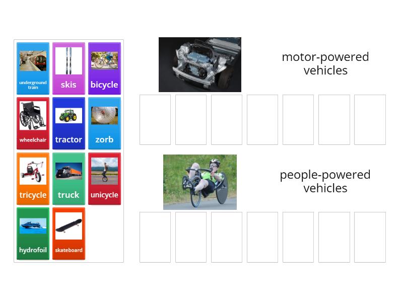 motor-powered vehicles: tractor , hydrofoil, underground train, truck, people-powered vehicles: bicycle, tricycle, unicycle, wheelchair, skateboard, skis, zorb,