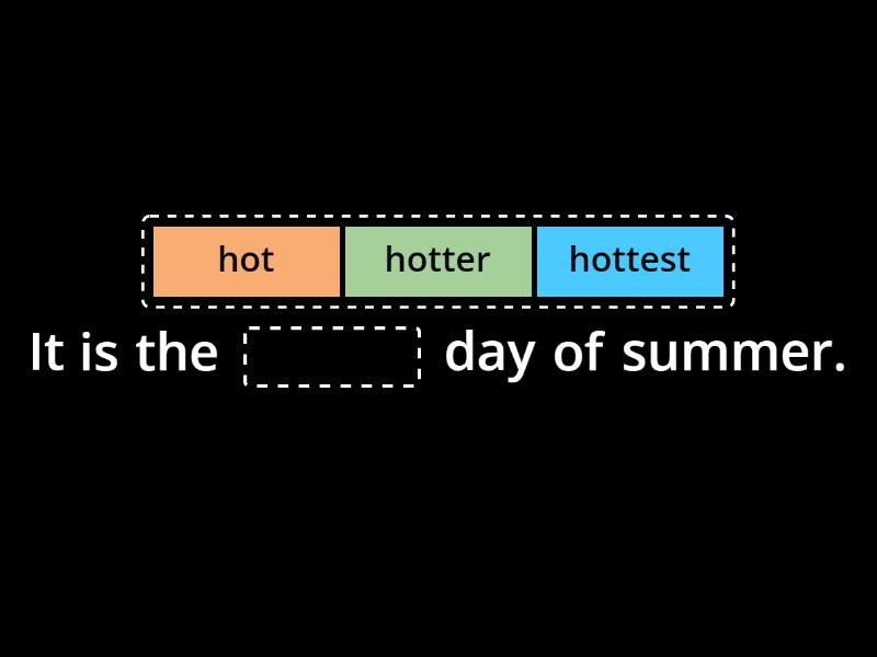 It is the ____ day of summer. My hands are ____ than his hands. I am the ____ in my class. This pig is ____ than that chicken. That is the ____ hill I've ever seen! Chloe ran ____ than Oli. Josh was the ____ runner of all. The hot dog was ____ than the flea. The whale is the ____ mammal. Mrs Turner is ____ than Mr Allsopp. Is the kit kat is ____ than the Easter Egg ? A lion is the ____ cat of all.____