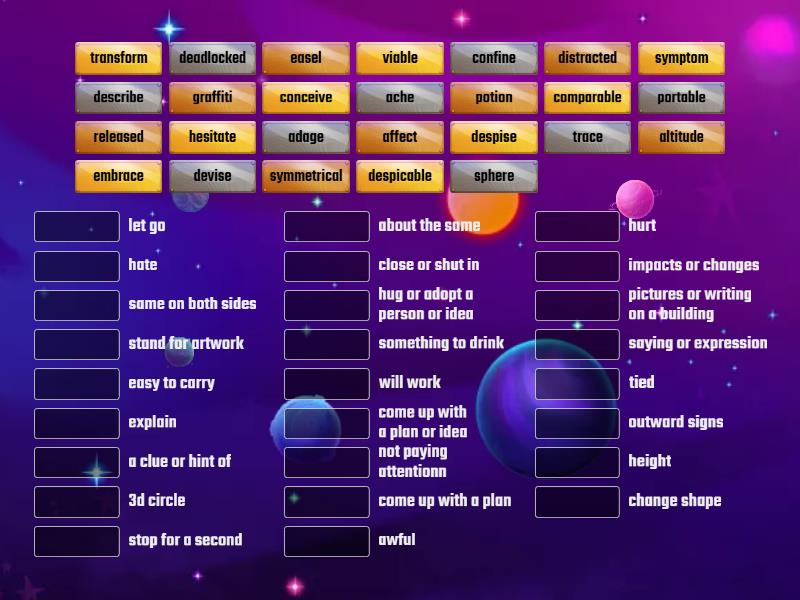trace - a clue or hint of, embrace - hug or adopt a person or idea, transform - change shape, potion - something to drink, despise - hate, despicable - awful, altitude - height, easel - stand for artwork, released - let go, devise - come up with a plan, hesitate - stop for a second, deadlocked - tied, portable - easy to carry, adage - saying or expression, graffiti - pictures or writing on a building, sphere - 3d circle, ache - hurt, symmetrical - same on both sides, viable - will work, symptom - outward signs, conceive - come up with a plan or idea, affect - impacts or changes, confine - close or shut in, describe - explain, distracted - not paying attentionn, comparable - about the same,