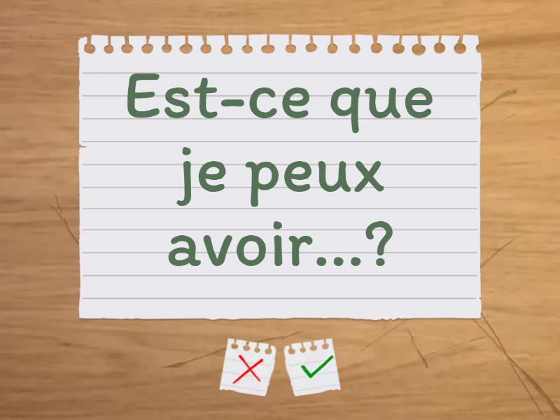 Est-ce que je peux avoir...? - Can I have...?, Un crayon - a pencil, un stylo - a pen, une gomme - a rubber, du papier - some paper, Est-ce que je peux chercher... - Can I look for..., mon cahier - my text book, mon agenda - my diary, mon ordinateur - my computer, un mouchoir - a tissue, de l'eau - some water, Est-ce que je peux aller...? - Can i go...?, à l'infirmier - to the nurse, à mon casier - to my locker, aux toilettes - to the toilet, à la bibliothèque - to the library,