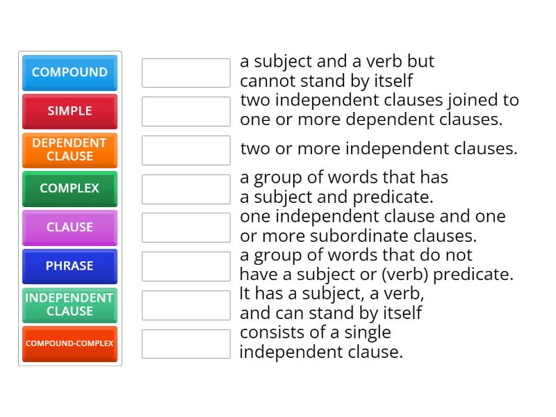 SIMPLE - consists of a single independent clause., COMPOUND - two or more independent clauses., COMPLEX - one independent clause and one or more subordinate clauses., COMPOUND-COMPLEX - two independent clauses joined to one or more dependent clauses., PHRASE - a group of words that do not have a subject or (verb) predicate., CLAUSE - a group of words that has a subject and predicate., DEPENDENT CLAUSE - a subject and a verb but cannot stand by itself, INDEPENDENT CLAUSE  - It has a subject, a verb, and can stand by itself,