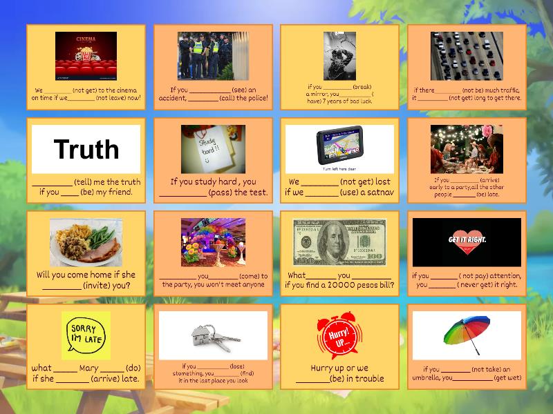 If you study hard , you __________ (pass) the test. - will pass, Will you come home if she ________ (invite) you? - invites, If you ___________ (see) an accident, ________ (call) the police! - see - call, We ________ (not get) lost if we _______ (use) a satnav - won't get -use, if you __________ (lose) stomething, you________ (find) it in the last place you look - lose -will find, if you ________ (not take) an umbrella, you___________ (get wet) - don't take-will get wet, if there________ (not be) much traffic, it _________ (not get) long to get there. - isn't-won't get, if you _________ (break) a mirror, you__________ ( have) 7 years of bad luck. - break-will have, We ________ (not get) to the cinema on time if we________ (not leave) now! - won't get-don't leave, If you _________ (arrive) early to a party,all the other people _______ (be) late. - arrive-will be , Hurry up or we _______(be) in trouble - will be, __________ you________ (come) to the party, you won't meet anyone - Unless-come, What_______ you _________ if you find a 20000 pesos bill? - will-do, what _____ Mary _____ (do) if she _______ (arrive) late. - will mary do -arrives, if you _______ ( not pay) attention, you _______ ( never get) it right. - don't pay - will never get, _________ (tell) me the truth if you ____ (be) my friend. - Tell me truth - are,