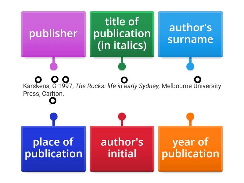 author's surname, author's initial, year of publication, title of publication (in italics), publisher, place of publication.
