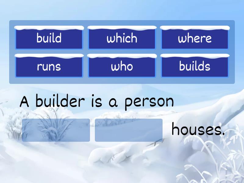 A builder is a person ________ houses. A hairdresser is somebody ________ your hair. A library is a place ____you can read or ____books. A campsite is a place ____people ____in tents. A fridge is something ________ food cold. A remote control is something ________ TV channels. An architect is someone ________ buildings. A cinema is a place ____you can ____ a film. An art gallery is a place ____you ____ paintings. Glasses are things ____ ____ you to see well. A bookshop is a place ____ you ____books. A giraffe is an animal ____ ____ a very long neck. A key is something ____ ____ doors. A pilot is a person ____ ____ airplanes. A tourist is a person ____ ____ another town, city or country.