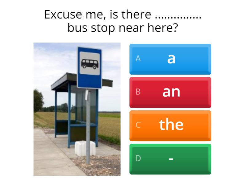 1) Excuse me, is there ............... bus stop near here? a) a b) an c) the d) - 2) How do I get to ................ station please? a) a b) an c) the d) - 3) Go down there till you come to ........... railway bridge. a) a b) an c) the d) - 4) How can I get to ....................... Trafalgar Square, please? a) a b) an c) the d) - 5) It´s next to a supermarket on ............. right. a) a b) an c) the d) - 6) The hotel is opposite ....... chemist´s a) an b) the c) a d) - 7) Go along ............... street. a) a b) an c) the d) - 8) Go along ...............Oxford Street. a) a b) an c) the d) - 9) Turn ......... left. a) a b) an c) the d) - 10) The reataurant is on .......... corner. a) the b) - c) a d) an 11) Take .................. second turning on the right. a) a b) an c) the d) - 12) Excuse me, where can I find ...................... nearest clinic? a) a b) an c) the d) - 13) Go past........... supermarket. a) a b) - c) the d) an 14) Excuse me, where can I find ................. Hyde Park? a) a b) an c) the d) - 15) Go over........... bridge a) a b) - c) the d) an 16) Excuse me, is there ................ underground station near here? a) a b) an c) the d) - 17) It´s on .................... other side of the river. a) a b) an c) the d) -