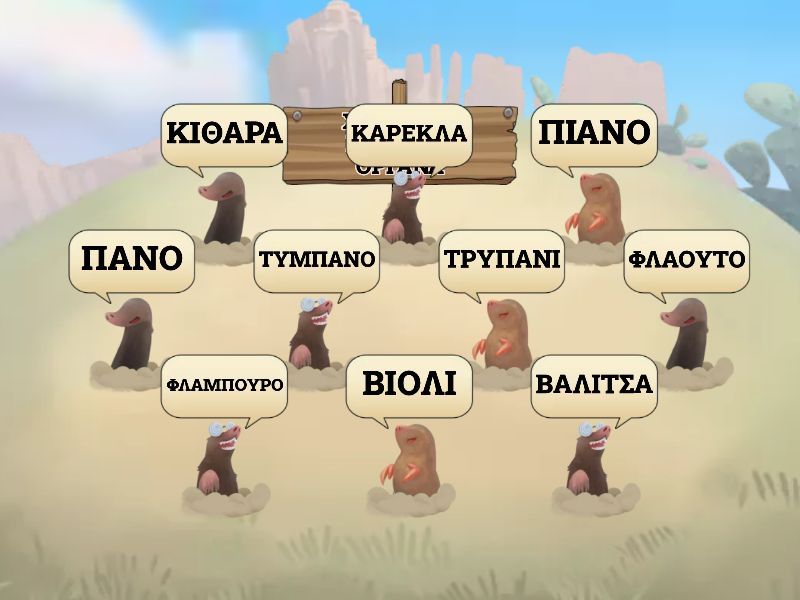 ΣΩΣΤΟ: ΚΙΘΑΡΑ, ΠΙΑΝΟ, ΤΥΜΠΑΝΟ, ΦΛΑΟΥΤΟ, ΒΙΟΛΙ, ΚΟΥΔΟΥΝΙΣΤΡΑ, ΛΑΘΟΣ: ΚΑΡΕΚΛΑ, ΠΑΝΟ, ΤΡΥΠΑΝΙ, ΦΛΑΜΠΟΥΡΟ, ΒΑΛΙΤΣΑ, ΚΟΥΔΟΥΝΙ,