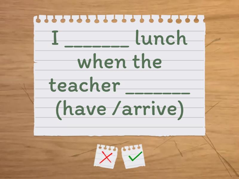 Tom _____ when he _____ a shark (dive/ see) - Tom was diving when he saw a shark., I _______ lunch when the teacher _______ (have /arrive) - I was having lunch when the teacher arrived, It _____ to rain while we _____ a picnic (start/have) - It started to rain while we were having a picnic, While Nick _____ TV, Mary ____ a book (watch/read) - While Nick was watching TV, Mary was reading a book., I ______ a marathon when I ____ down. (run/fall) - I was running a marathon when I fell down., When the phone ______ she _____ on the beach (ring/sunbathe) - When the phone rang, she was sunbathing on the beach., They ______ the window while they _______ football. (break/play) - They broke the window while they were playing football., Sam ___ the clothes while Ann _______ on the sofa (iron/relax) - Sam was ironing the clothes while Ann was relaxing on the sofa., He _____ his leg while he _____ (break/skate) - He broke his leg while he was skating., ________ fast when she _____ an accident? (she/drive/have) - Was she driving fast when she had an accident?, He _____ a lot of friends while he ______ in the USA. (make/live) - He made a lot of friends while he was living in the USA.,