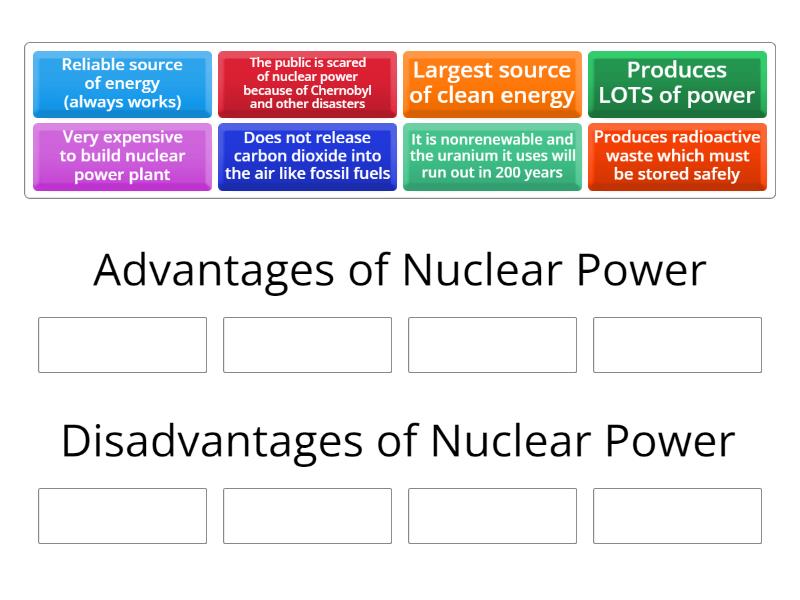 Advantages of Nuclear Power: Does not release carbon dioxide into the air like fossil fuels, Produces LOTS of power, Reliable source of energy (always works), Largest source of clean energy, Disadvantages of Nuclear Power: Produces radioactive waste which must be stored safely, Very expensive to build nuclear power plant, The public is scared of nuclear power because of Chernobyl and other disasters , It is nonrenewable and the uranium it uses will run out in 200 years,