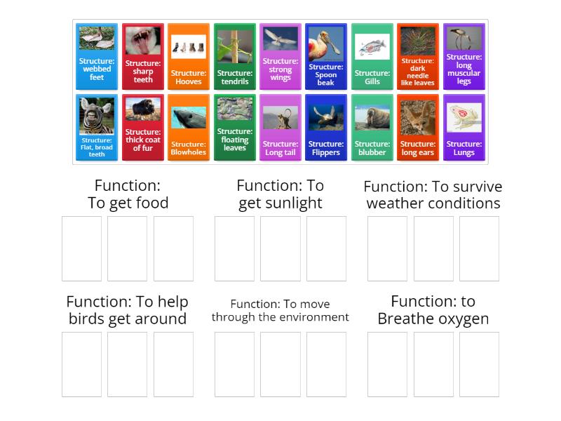 Function: To get food: Structure: Flat, broad teeth, Structure: Spoon beak, Structure: sharp teeth , Function: To get sunlight: Structure: dark needle like leaves, Structure: floating leaves, Structure: tendrils, Function: To survive weather conditions: Structure: blubber, Structure: thick coat of fur, Structure: long ears, Function: To help birds get around: Structure: webbed feet, Structure: long muscular legs, Structure: strong wings , Function: To move through the environment: Structure: Hooves, Structure: Flippers, Structure: Long tail, Function: to Breathe oxygen: Structure: Lungs, Structure: Gills, Structure: Blowholes,