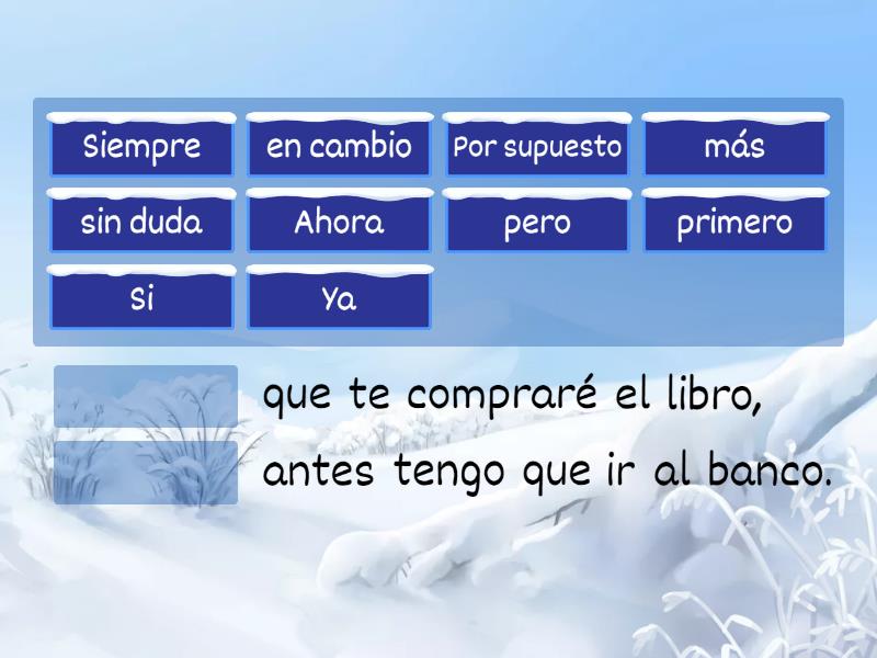 ____ que te compraré el libro, ____ antes tengo que ir al banco. No es el momento de lamentarse, ____ de actuar;____, manos a la obra. "Cuando Dios mira mi trabajo, se complace.____ cuando observa mi salario, llora" Norbert Booi. El cigarrillo puede triplicar el riesgo de sufrir enfermedades del corazón,____ el humo fuerza a este órgano a trabajar más de lo normal;____ propicia el aumento de ácidos grasos en la sangre. En los Andes sólo algunos ríos alcanzan a llegar al mar,____ la mayoría terminan siendo sólo quebradas secas ____ las aguas se pierden a medio camino. Que el tabaco es dañino para la salud nadie lo ignora,____ las evidencias son múltiples; daños en el pulmón, en el aparato circulatorio, etc. ;____difícil es erradicar el vicio si tenemos a la publicidad detrás de él. El trasplante del corazón no fue sólo un gran aporte en la medicina, ____ constituyó también un precedente en la historia de la humanidad, ____ con este avance el hombre entendió el periodo de su vida considerablemente.