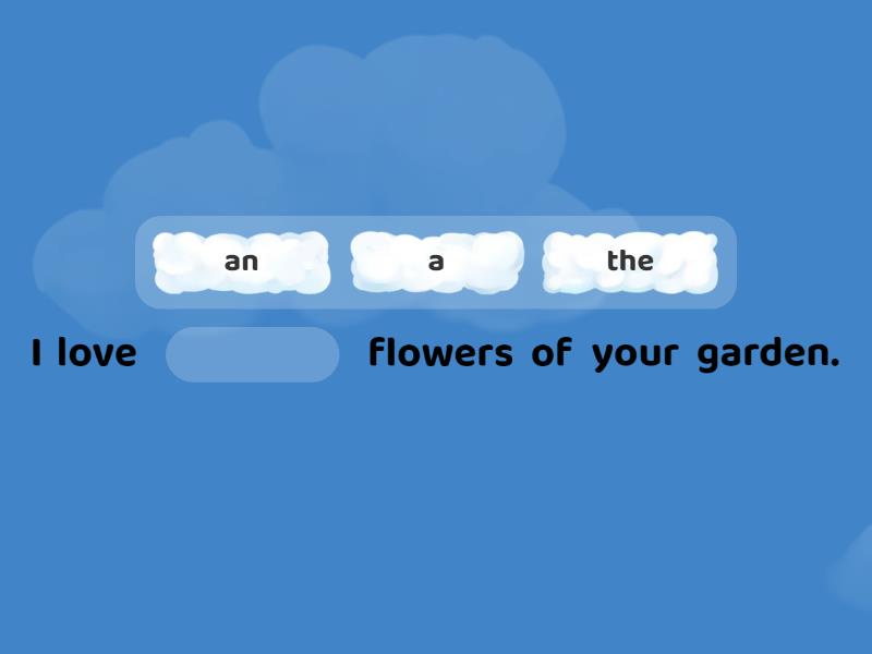 I love ____ flowers of your garden. Susan does not eat ____ red meat. Dan has ____ good friend. I saw ____ ant over there. Josephine is ____ intelligent girl. When my mother was a little girl, she had ____ puppy. She has ____ pet. ____ pet is a hamster. When I grow up, I want to be ____ designer. That boy is preparing the boat to go to ____ trip.