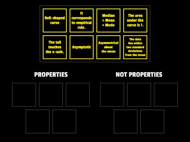 PROPERTIES: Median = Mean = Mode, Asymptotic, Bell-shaped curve, It corresponds to empirical rule., The area under the curve is 1., NOT PROPERTIES: Asymmetrical about the mean, The data lies within two standard deviations from the mean, The tail touches the x-axis.,