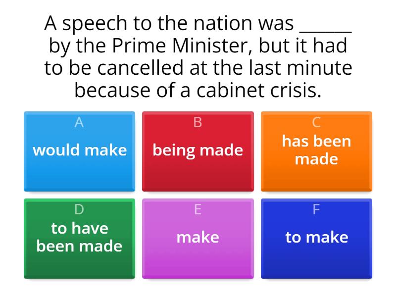 1) A speech to the nation was ______ by the Prime Minister, but it had to be cancelled at the last minute because of a cabinet crisis. a) would make b) being made c) has been made d) to have been made e) make f) to make 2) The last days of the holiday ______ by rain. a) was spoiled b) are spoiled c) were spoiled d) have been spoiled e) spoil f) spoiled 3) They have used up all the petrol in the tank. All the petrol in the tank ________________ up. a) has been using b) will have been used c) has been used d) have been used e) have used f) used have 4) It _____________ that we need eight hours' sleep each night a) is estimated b) estimates c) be estimated d) was estimate e) estimated f) would be estimated 5) Heart disease is known to _______________ over 80000 deaths in the UK last year. a) cause b) were caused c) have caused d) have been caused e) have cause f) caused