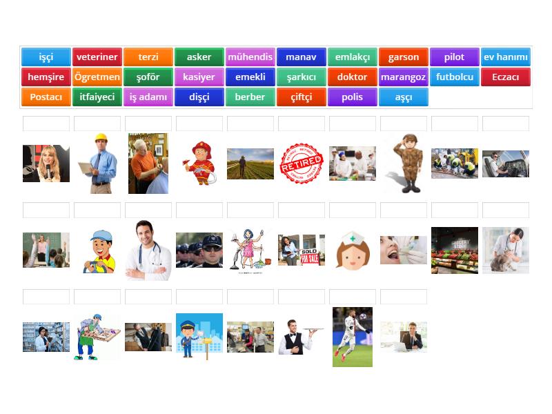 polis, Ögretmen, itfaiyeci, veteriner, doktor, aşçı, asker, pilot, Postacı, terzi, işçi, futbolcu, dişçi, garson, şarkıcı, mühendis, şoför, çiftçi, marangoz, hemşire, emlakçı, iş adamı, Eczacı, emekli, manav, berber, ev hanımı, kasiyer,