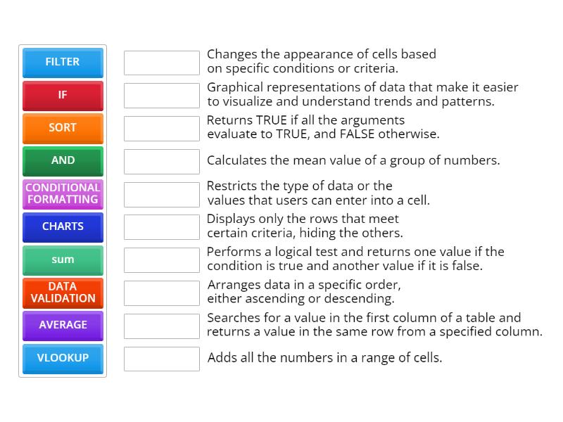 SORT - Arranges data in a specific order, either ascending or descending., FILTER - Displays only the rows that meet certain criteria, hiding the others., VLOOKUP - Searches for a value in the first column of a table and returns a value in the same row from a specified column., sum - Adds all the numbers in a range of cells., AVERAGE - Calculates the mean value of a group of numbers., IF - Performs a logical test and returns one value if the condition is true and another value if it is false., CONDITIONAL FORMATTING - Changes the appearance of cells based on specific conditions or criteria., DATA VALIDATION - Restricts the type of data or the values that users can enter into a cell., CHARTS - Graphical representations of data that make it easier to visualize and understand trends and patterns., AND - Returns TRUE if all the arguments evaluate to TRUE, and FALSE otherwise.,