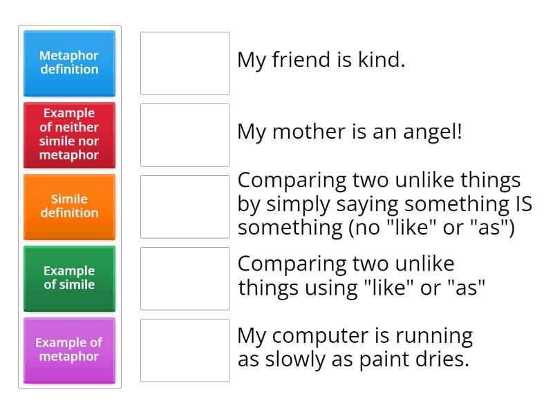 Simile definition - Comparing two unlike things using "like" or "as", Metaphor definition - Comparing two unlike things by simply saying something IS something (no "like" or "as"), Example of simile - My computer is running as slowly as paint dries., Example of metaphor - My mother is an angel!, Example of neither simile nor metaphor - My friend is kind.,