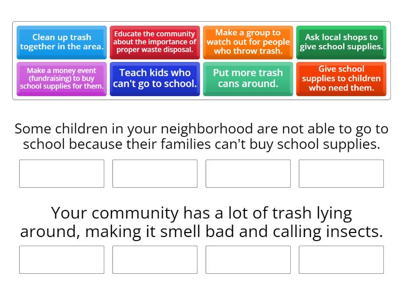 Some children in your neighborhood are not able to go to school because their families can't buy school supplies.: Give school supplies to children who need them., Make a money event (fundraising) to buy school supplies for them., Ask local shops to give school supplies., Teach kids who can't go to school., Your community has a lot of trash lying around, making it smell bad and calling insects. : Clean up trash together in the area., Put more trash cans around., Educate the community about the importance of proper waste disposal., Make a group to watch out for people who throw trash.,