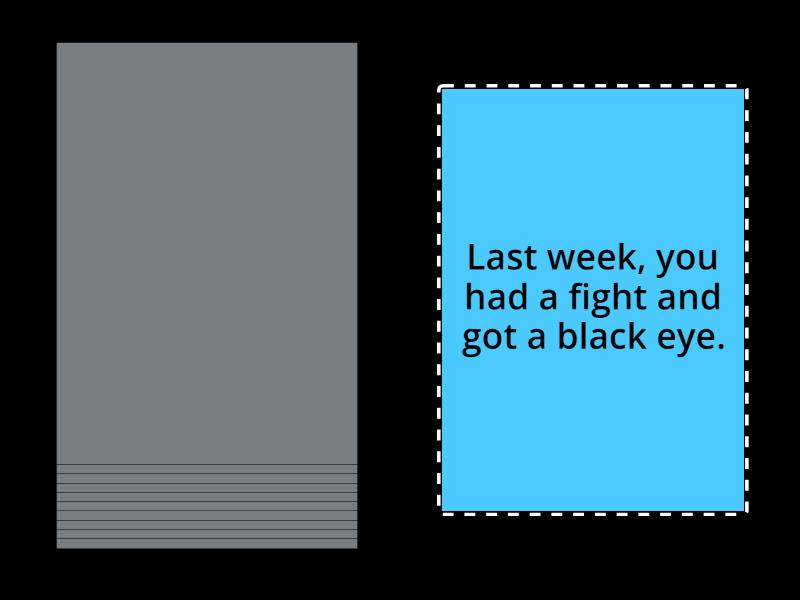 Last week, you lost your passport at the airport and couldn't board the plane to go on holiday., Last week, you parked your car on the high street but didn't see the 'No parking' sign and received a parking fine., Last week, you took a bus from the city centre to the airport. You were late. , Last week, you forgot to water your plants and they died., Last week, you became sick because you didn't take an umbrella when it was raining outside., Last week, you had a fight and got a black eye., Last week, you had a good idea for a new product and got promoted., Last week, you were invited to a party. At the party, you met your favourite actor., Last week, you didn't make an appointment with the dentist and later you had a terrible toothache., Last week, you found $200 in the street and bought a new mobile phone., Last week, you ate some undercooked chicken and had food poisoning..