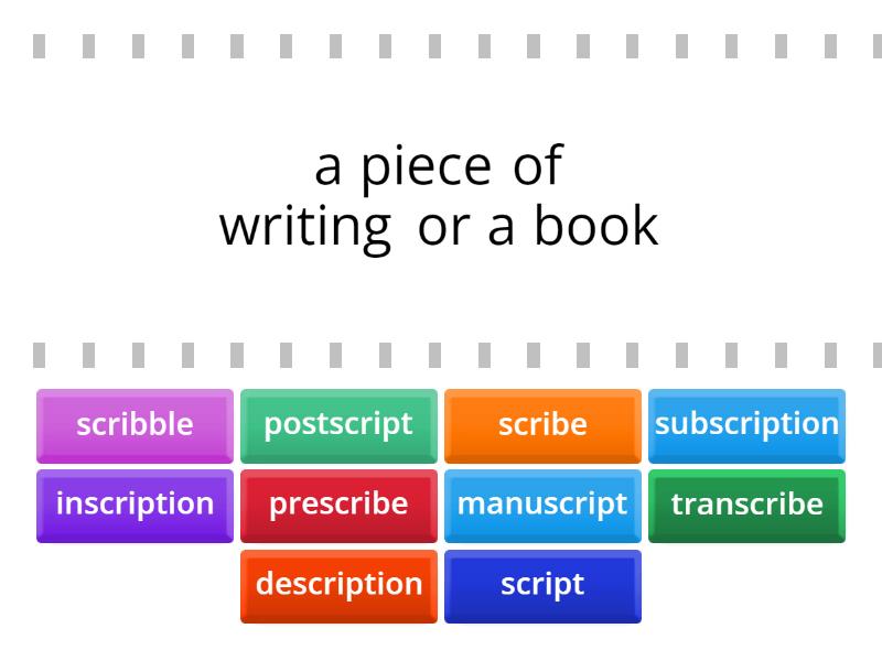 manuscript - a piece of writing or a book, prescribe - advise and authorize the use of medicine, in writing, scribe - one who writes, transcribe - to record or write down, scribble - make marks or doodle, script - set of papers with words on them that are acted out, postscript - a writing added after a letter is sent, description - say/write how something looks, inscription - a engraving or dedication, subscription - a written agreement to buy and read/watch something for a period of time,